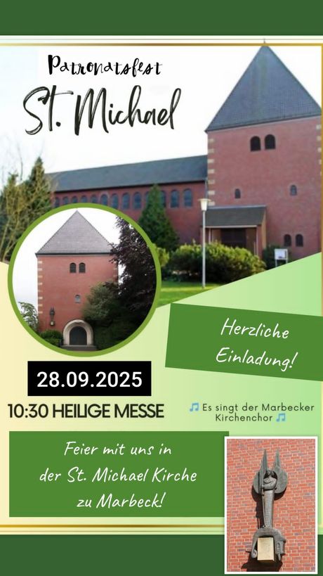 Die Gemeinde St. Michael Marbeck lädt herzlich ein zum Patronatsfest am Sonntag, 28.09. um 10:30 Uhr. Es sind der Marbecker Kirchenchor. Feiern Sie mit!